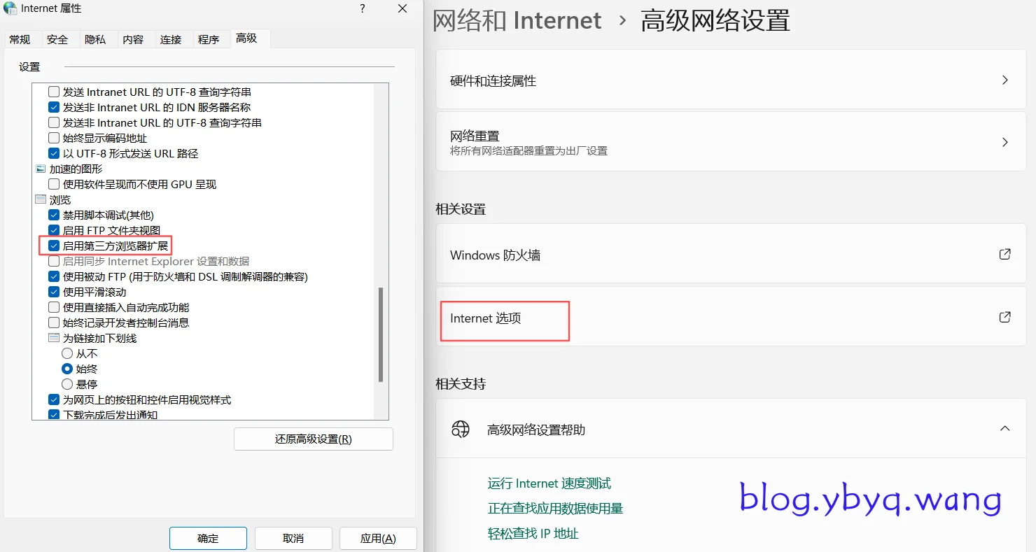 - Internet 属性:进入“高级”选项卡,确保勾选了